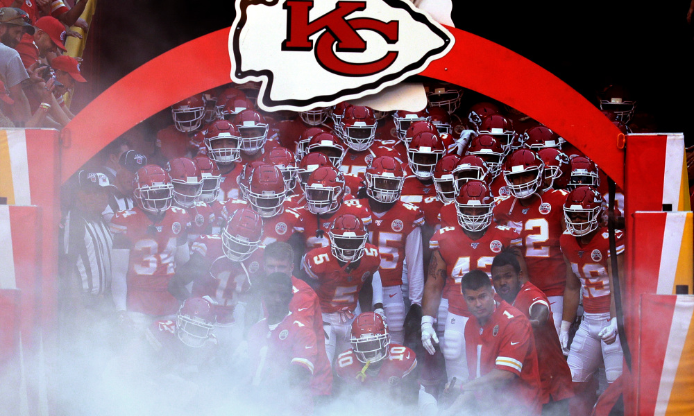 Kansas City Chiefs players run onto the field before an NFL football game against the San Francisco 49ers Saturday, Aug. 24, 2019, in Kansas City, Mo. (AP Photo/Charlie Riedel)