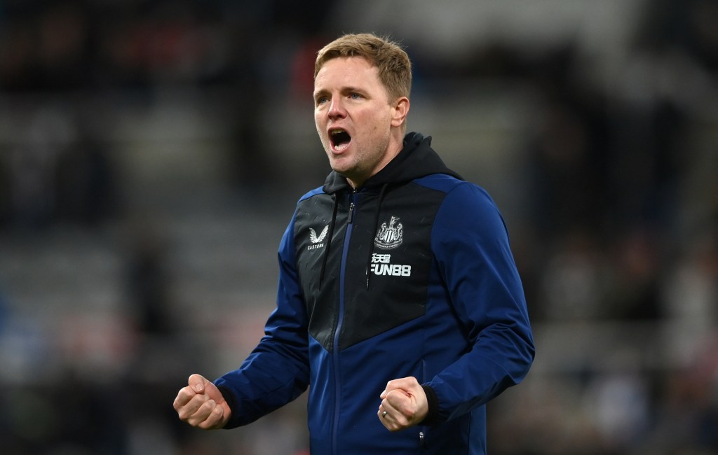 NEWCASTLE UPON TYNE, ENGLAND – DECEMBER 04: Newcastle manager Eddie Howe celebrates with the fans after the Premier League match between Newcastle United and Burnley at St. James Park on December 04, 2021 in Newcastle upon Tyne, England. (Photo by Stu Forster/Getty Images)